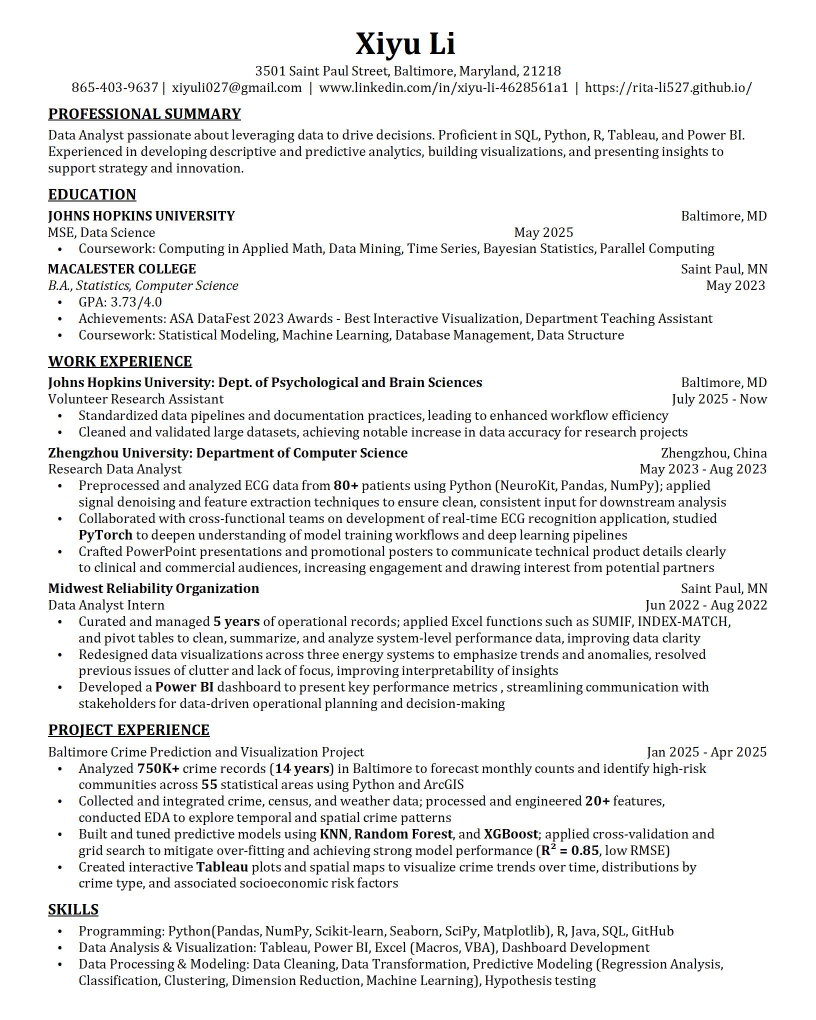 Hi, I'm Xiyu Li, a passionate Data Analyst with a strong academic background in statistics and computer science. I recently earned a Master of Science in Engineering in Data Science from Johns Hopkins University (May 2025), and I hold a B.A. in Statistics and Computer Science from Macalester College. I developed my skills in machine learning, statistical modeling, and data visualization through hands-on projects and academic research.